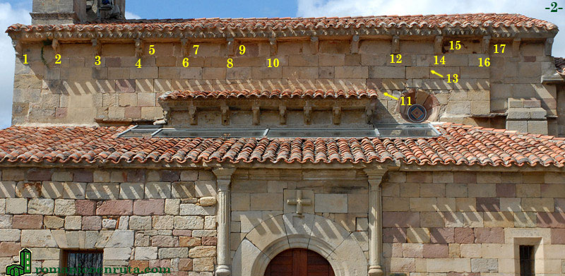 En cuanto a los canecillos que soportan el alero de la nave, sólo los de la fachada sur merecen ser detallados ya que en la fachada norte todos son de proa de nave o caveto simple y no presentan figura alguna. En la foto inferior aparecen los 14 canes del alero sur, que describimos a continuación.