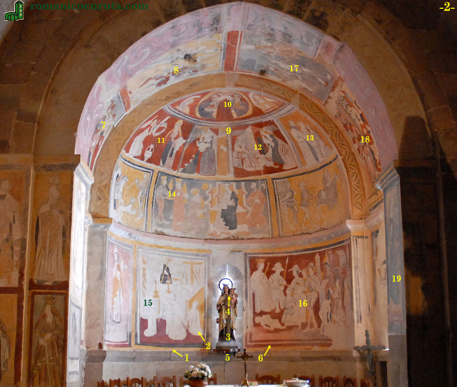 Las pinturas de la cabecera ocupan la totalidad de los muros y en ellas se representan, en un cierto desorden, escenas de la vida y pasión de Jesucristo, la Virgen y algunos santos (enlaces 1 a 6). En el intradós del arco triunfal, en el lado izquierdo, aparece una de las pocas imágenes en pintura muraria de un jabalí (enlace 1). En el tramo presbiterial, aparte de un San Miguel luchando contra el demonio en el registro inferior (enlace 1), cuatro escenas se reparten el espacio de la cubierta: una primera de la que ignoramos su interpretación (enlace 7); un posible martirio de San Sebastián (enlace 8); la Flagelación (enlace 17); y Cristo portando la Cruz camino del Calvario (enlace 18 y foto inferior).