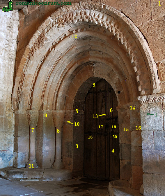 Si interesante es la portada de acceso al templo (foto 1), no lo son menos los herrajes que refuerzan ambos batientes. Empecemos por aquella. Se protegió con un pórtico en 1671, como informa una inscripción en uno de los sillares. El arco es de medio punto y se compone de cuatro arquivoltas y chambrana de rosetas (enlaces 1/2). Solo las arquivoltas dos y cuatro apoyan sobre columnas acodilladas con capiteles. De fuera a adentro se decoran con billetes, bocel entre serie de puntas de diamante y sogueado, dos boceles y bocel entre escocias (enlaces 5/6/12).