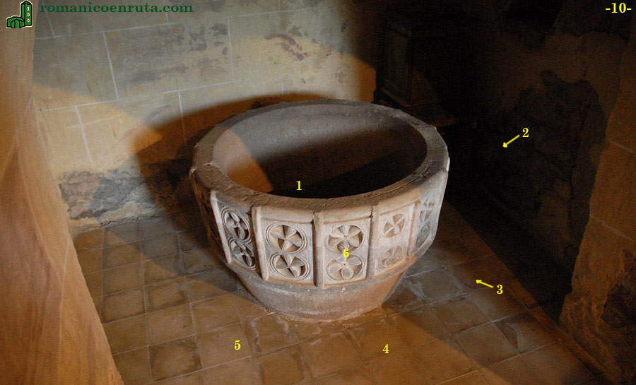 Tanto esta iglesia como la de Revilla de Santullán conservan en su interior dos pilas bautismales de inmersión. La que ahora nos ocupa se encuentra en una pequeña dependencia situada en el muro norte a la altura del tercer tramo de la nave (foto 10) empezando por la derecha, el lado más cercano al presbiterio. Se trata de una pieza construida en un único bloque de piedra arenisca de forma troncocónica invertida dividida en dos cuerpos por un bocel que señala la transición entre el pie y la copa.