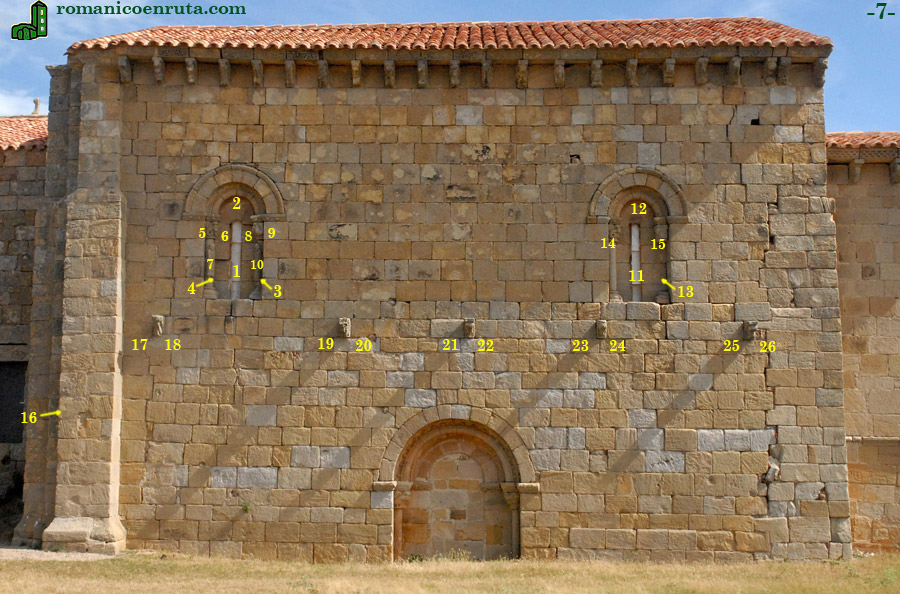 La ventana de la derecha (enlace 11) también es de arquivolta interior de grueso bocel, rosca exterior y chambrana abilletada (enlace 12). Las columnas no llevan relieves y el fuste de la columna derecha se ha perdido. La cesta del capitel izquierdo (enlace 14) repite el motivo de la cabecita con tallos vegetales ya visto en la ventana del lado izquierdo (enlaces 5/6); la del capitel derecho nos presenta a dos personajes de pie muy desgastados que parecen sostener una tercera cabecita humana en la esquina de la cesta (enlace 15). |