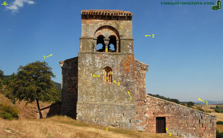 En el cuerpo inferior, en su muro oeste, se abre una ventana (enlaces 8/10) con arco de medio punto que apea sobre columnillas acodilladas (enlace 9). El capitel de la columna de la izquierda presenta una cesta con caulículos superpuestos (enlace 11) mientras que el de la columna derecha es liso (enlace 12). En el cuerpo superior, el que alberga las campanas, se abren cuatro ventanas geminadas con arcos de medio punto separadas por gruesas columnas con capiteles sin decoración (enlaces 2/6/7). |