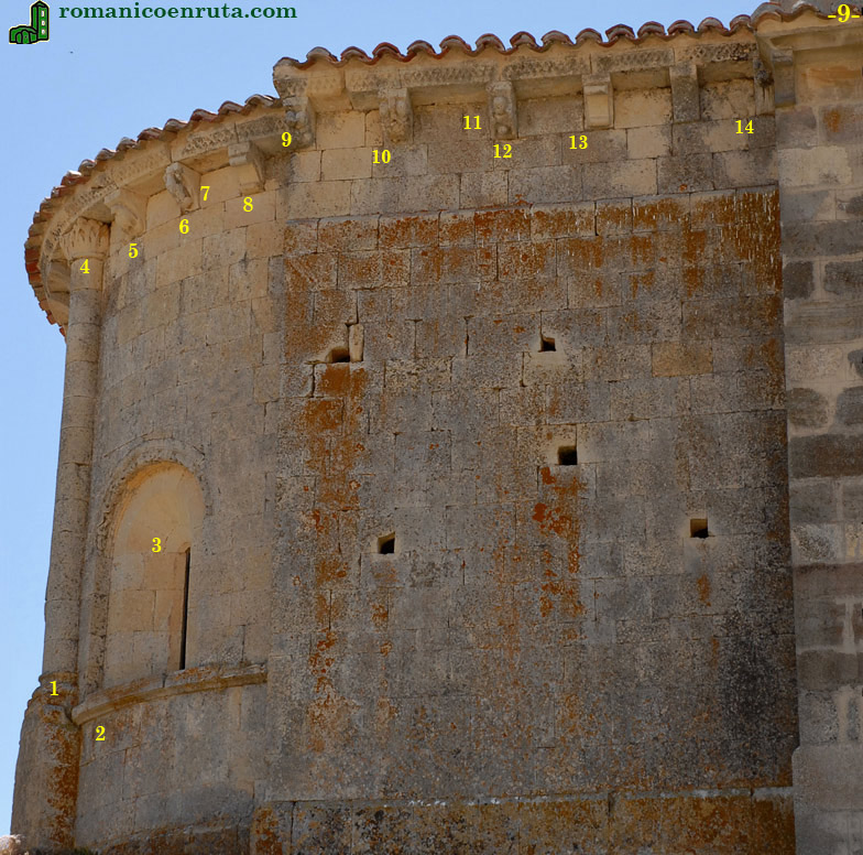 Los canes de la cornisa son algo más variados. En la calle norte, junto al capitel de la columna entrega, el primer can (enlace 5) nos presenta un ave que, pura casualidad, atrajo la atención de un congénere en el momento de tomar la imagen. A este le sigue otro en que se esculpe un cuadrúpedo, tal vez una liebre (enlaces 6/7) y, por último, un caveto con rollos horizontales (enlace 8). Ya en el tramo norte del presbiterio observamos otros seis que se decoran con motivos vegetales (enlaces 9/10), un hombre itifálico (enlaces 11/12), caveto con rollos (enlace 13), liso, y acantos (enlace 14). |