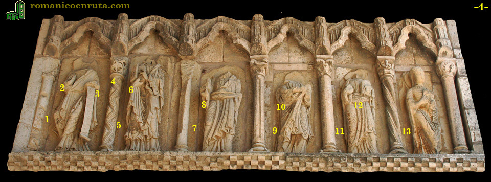 De los apóstoles del lado derecho (foto 4), solo el del extremo oriental conserva la cabeza. Y dos de los capiteles de las columnas también han desaparecido. Durante la Guerra de la Independencia la iglesia sufrió un incendio en 1811 que la destruyó casi por completo e impidió la celebración de cultos religiosos en su interior, y no fue hasta 1849 en que se acometieron obras de reacondicionamiento.