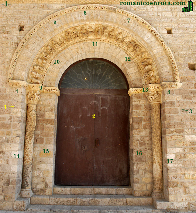 La portada occidental de la iglesia de Santiago (foto 1) se compone de chambrana decorada con hojas de vid y racimos (enlaces 5 a 7) y una sola arquivolta entre dos roscas lisas de medio punto (foto inferior). Tanto la rosca exterior como la interior apean directamente sobre las jambas (enlaces 9/13), mientras que la central sobre dos columnas con capiteles historiados. Sólo esta última viene decorada por una serie de 22 personajes en disposición radial a los que se añaden, en los extremos del arco, dos leones.