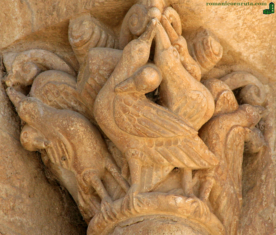 El arco de la ventana, con el guardapolvos de billetes (enlace 11), se compone de dos arquivoltas, lisa la exterior y de grueso baquetón la interior. Esta última apoya sobre los cimacios lisos de dos capiteles: el de la izquierda se trabaja con palmetas inscritas en círculos y el motivo de la Madre Tierra (enlaces 16/17), mientras que el de la derecha (enlace 12 y foto inferior) con ocho pelícanos que, en la simbología románica, representan a Jesucristo ya que desde antiguo se creía que estas aves alimentaban a sus crías con su propia sangre.