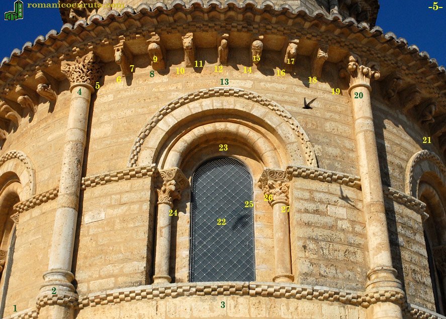 La ventana central (enlaces 22/23) es como todas las de la cabecera y sus capiteles son de excelente factura. El de la izquierda (enlace 24) presenta en la parte inferior de la cesta roleos con palmetas inscritas; sobre estos se tallan grandes hojas de acanto verticales y caulículos en las esquinas superiores. El de la derecha (enlaces 25 a 27) nos muestra a dos personajes que parecen abrazarse y que han sido interpretados como el recibimiento de un alma en la mansión celestial.