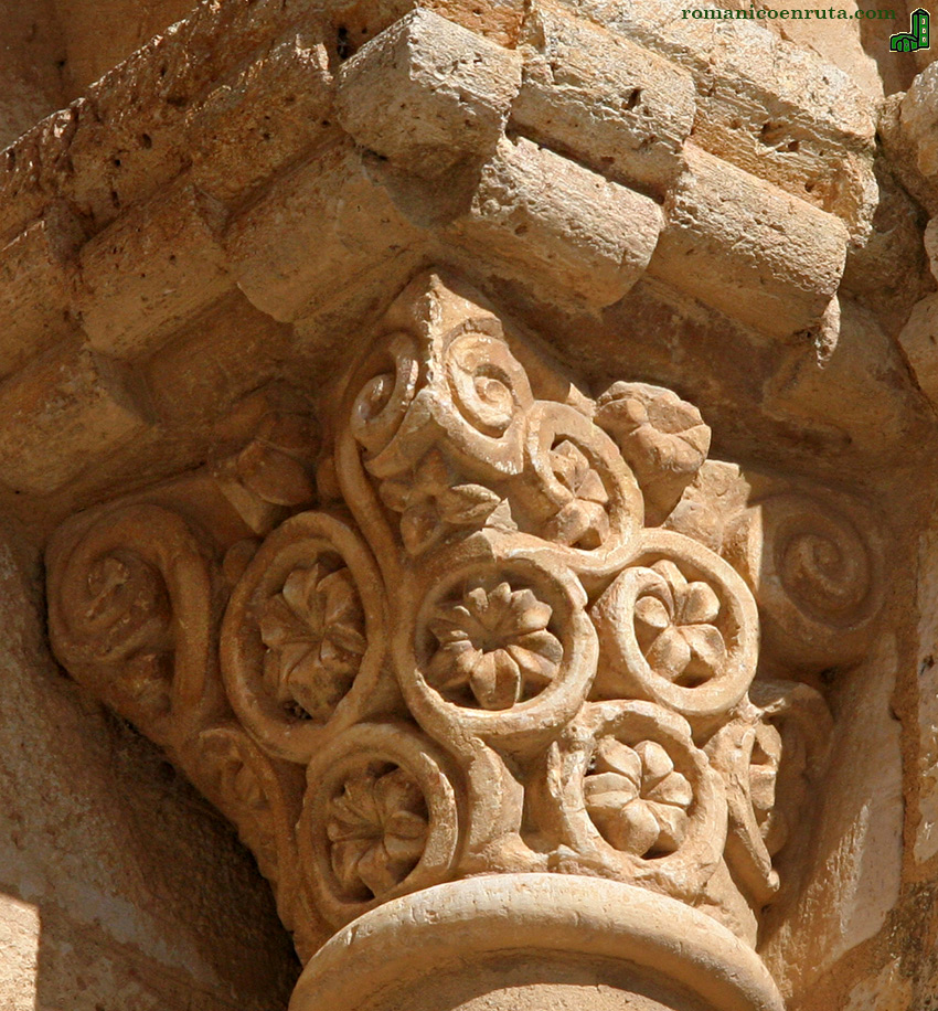 Las de la nave sur (foto 3, enlaces 3/9/15) decoran las cestas de los capiteles con los siguientes motivos: entrelazo (enlace 7), roleos vegetales con flores inscritas de seis pétalos (enlace 8 y foto inferior), acantos y espirales en las esquinas (enlace 13), palmetas inscritas en veneras (enlace 14), hojas verticales de palma con frutos o bolas (enlace 19) y entrelazo vegetal (enlace 20).