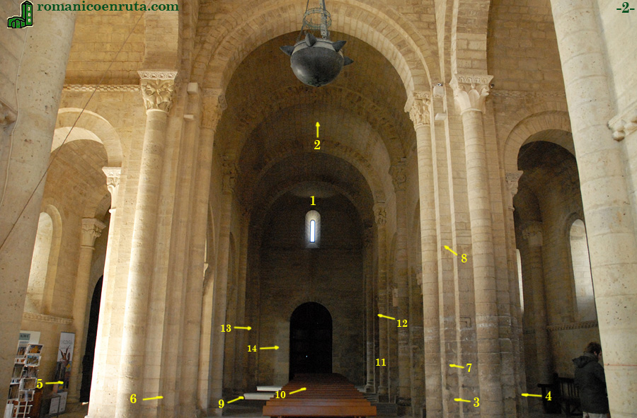 La fotografía inferior nos ofrece una vista general del interior de San Martín tomada desde el tramo presbiterial del ábside central. En primer término, los pilares cruciformes en que apoyan los arcos torales que sostienen el cimborrio. Notad la diferencia de anchura entre las naves laterales y la nave central.