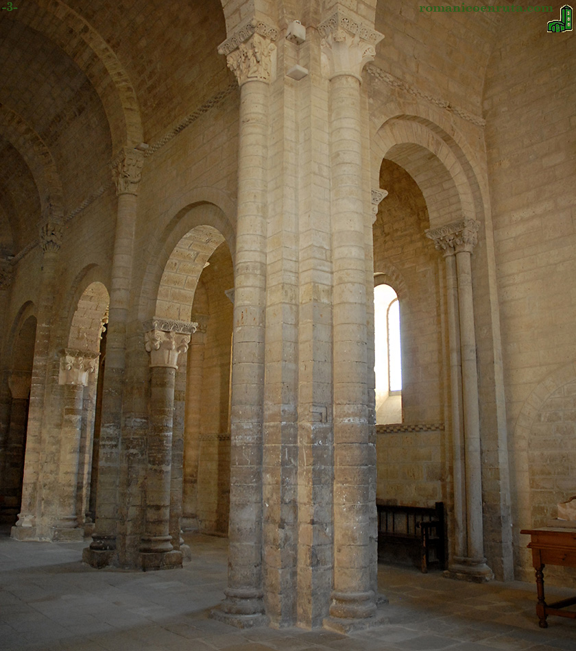 Todas las naves se cubren con bóveda de cañon reforzado por arcos fajones. Las cubiertas de la cabecera son las acostumbradas: de cañón en el tramo presbiterial de la nave central (las laterales carecen de él) y de cuarto de esfera en los tres ábside semicirculares. En el crucero, la cúpula (enlace 2) descansa sobre trompas. En la nave central, una imposta taqueada une los cimacios de los capiteles de las semicolumnas (enlaces 8/12 y foto 3).