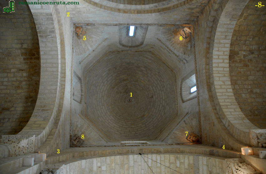 La intersección del transepto con la nave central se cubre con una gran cúpula asentada sobre trompas (fotos 1 a 7). Los cuatro arcos torales apean sobre columnas entregas rematadas con capiteles. Los pilares en que se abre el arco de triunfo del ábside central son de sección cruciforme, mientras que los que dan a la nave central presentan sección rectangular.