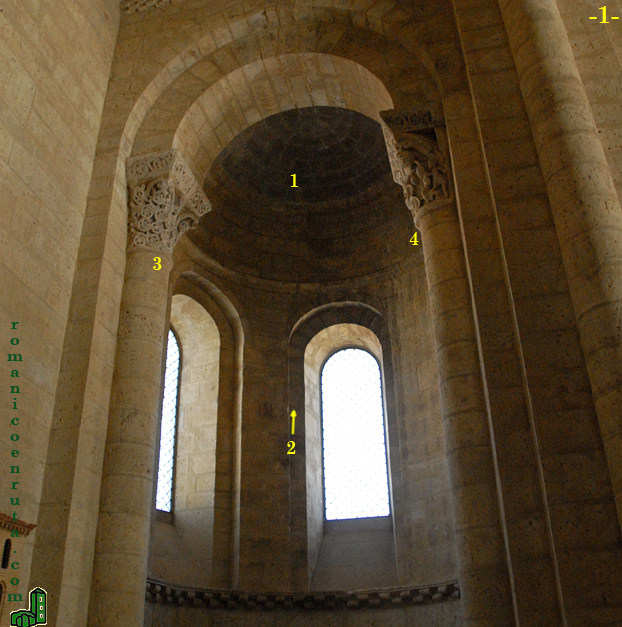 Aquellos que por su riqueza escultórica merezcan un estudio más pormenorizado, como por ejemplo los capiteles del arco de acceso al ábside norte (foto superior), se explicarán en páginas independientes, a las que accederéis con facilidad haciendo clic en el enlace numérico correspondiente, en este caso los enlaces 3 y 4 de la foto 1.