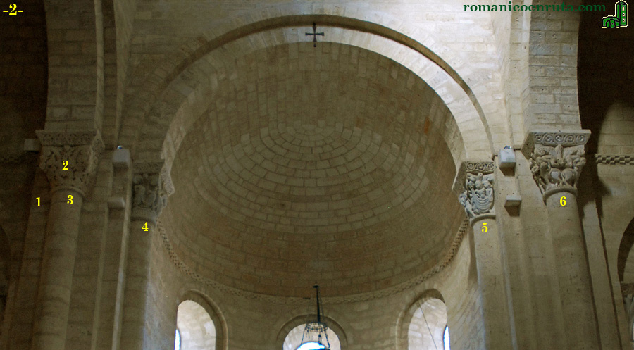 Nos encontramos frente al altar mayor, en la intersección entre la nave central y el transepto, donde detallaremos los capiteles 3 a 6: los del lado este de los arcos torales que sostienen la cúpula (enlaces 1 a 3 y 6) y los del arco de triunfo del ábside central (enlaces 4/5). Desgraciadamente, en muchas ocasiones lo observado ya no es la pieza original, sino la reproducción de finales del XIX, principios del XX.