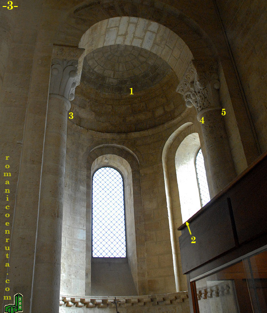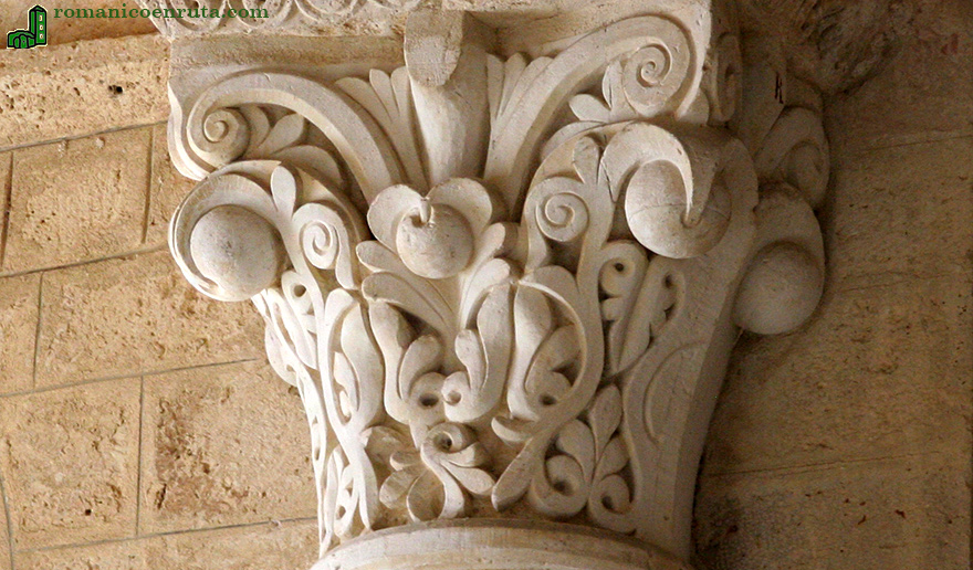 Pasemos al ábside meridional o de la epístola. El arco de doble rosca apea sobre dos capiteles (enlaces 1/2) que también han sido reformados, ya sea en parte o por completo. El del lado izquierdo (enlace 3) es el que presenta una cesta más sencilla: grandes hojas verticales de palma con frutos en las esquinas. El cimacio se decora con veneras en las que se inscriben palmetas.