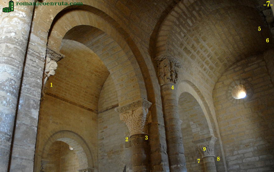 Nos situamos ahora en los dos últimos tramos de la nave septentrional. El primer capitel que vamos a describir, con página independiente (enlace 1 y foto inferior), es uno de los más curiosos y originales del templo: se trata del número 23, conocido como el de la fábula de la zorra y el cuervo. Su pareja, el número 24 (enlaces 2/3), se decora con excelente labor de entrelazo.