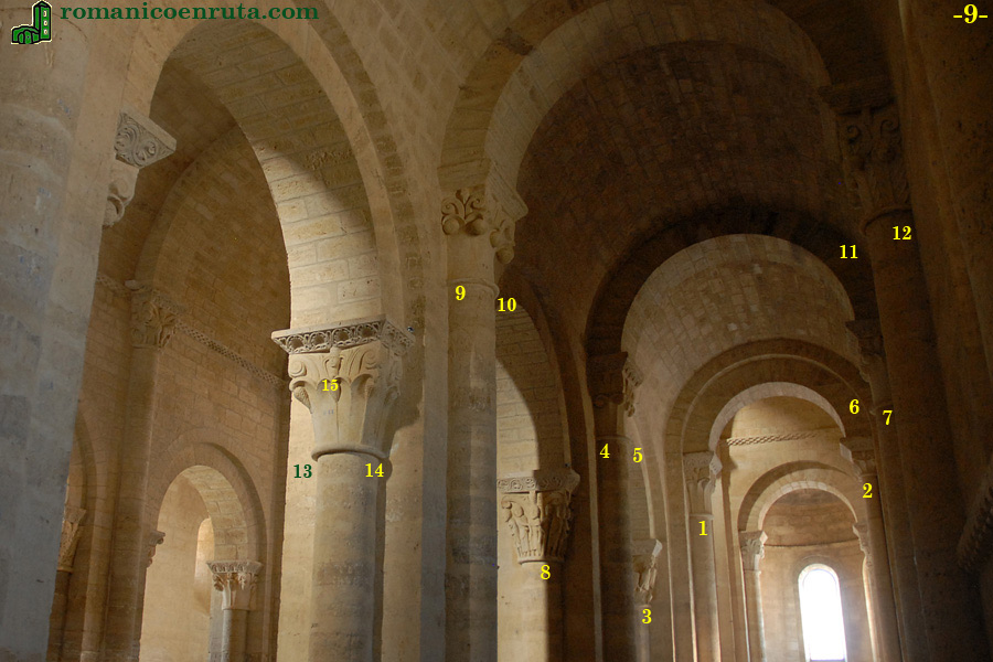 La numeración propuesta por Jesús Herrero y Carlos Arroyo continúa, saltándose los capiteles de la nave central, con los de la nave lateral sur, empezando por los más cercanos a la cabecera (foto 9). Los que se tratan en páginas independientes son: capitel número 29 (enlace 1); capitel 31 (enlace 3); y capitel 35 o del Prendimiento (enlace 8 y foto inferior de detalle), estrechamente relacionado con el número 36, del que os detallamos la descripción en la página siguiente.