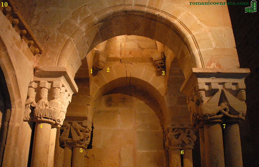 Los cuatro capiteles sobre los que descansa la cúpula son historiados. Empezaremos su descripción por el capitel noroeste (enlace 4, número 1 de la serie), para seguir con el noreste (enlace 5, número dos de la serie), el sureste (enlace 6, número tres) y el suroeste (enlace 7, número 4). Cada uno de los enlaces os llevará a una nueva página en que se describen los capiteles individualmente. |