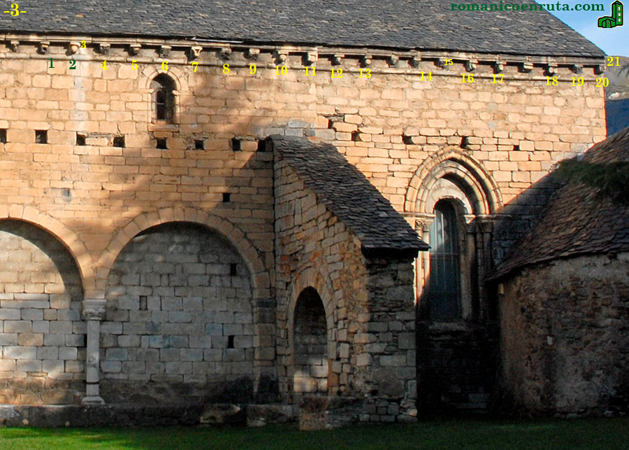 Acercándonos a la cabecera, hasta la altura del contrafuerte, la serie de canes del alero meridional continúa con los siguientes motivos: la cabeza de un monje (enlaces 1/2/3); un objeto que podría tratarse de un cáliz o de un candelabro (enlace 4); un objeto en forma de aro (quizás para apoyar sartenes sobre el fuego) con cuatro pies (enlace 5); un pavo real o urogallo (enlace 6); una máscara o demonio (enlace 7); dos aspas terminadas en espirales (enlaces 8/9); una cabeza humana (enlace 10) y una máscara (enlace 11).