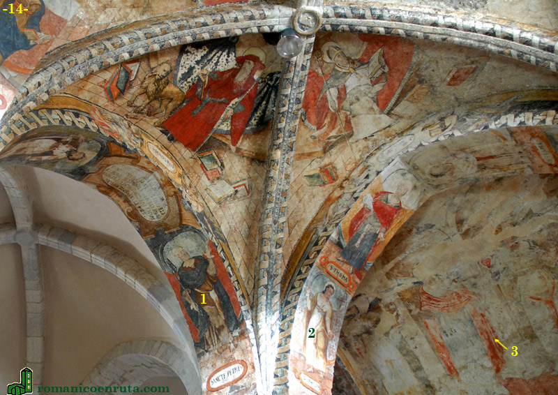 Las cubiertas del primer tramo de las tres naves se decoran con pinturas que ya no pertenecen a la época románica (fotos 12/13). Las pinturas que recubren gran parte del transepto son barrocas, de los siglos XVI-XVII (foto 14) y representan, en su mayoría, escenas de santos (enlaces 1 a 3).