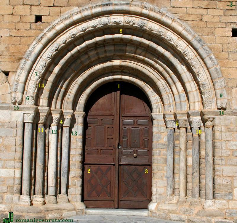 Las cuatro arquivoltas interiores (foto 3, enlace 1) son lisas y se componen en su mayoría con amplios boceles y escocias. La arquivolta exterior y la chambrana son los únicos elementos de la portada que fueron decorados (enlaces 7/8). La primera, un grueso baquetón, lleva dos largos vástagos entrecruzados en el intradós (enlace 14) mientras que en el extradós, salvo en la dovela central, donde podemos observar un cuadrúpedo (enlace 8), se esculpen motivos generalmente vegetales. El guardapolvos arranca, en ambos extremos, de una pequeña ménsula con dos cabezas humanas (enlaces 6/9) de rostro algo grotesco (enlaces 15/16) y es recorrido en toda su longitud por una cinta o tallo ondulado con pequeñas hojas.