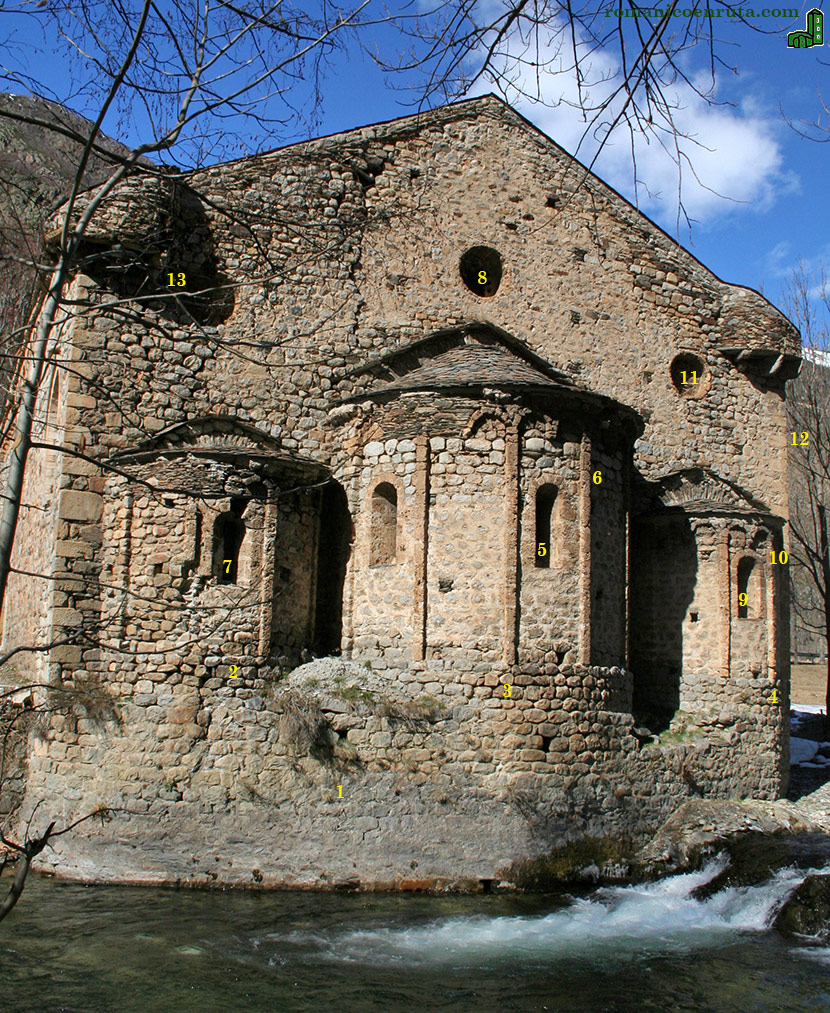 Para poder contemplar su cabecera, que pende sobre las aguas, tendremos que pasar al otro lado del Noguera-Pallaresa por un sendero que empieza al lado del puente que salva el río aguas abajo un poco antes de llegar a Sant Joan. No es un camino fácil si, como nos ocurrió a nosotros, la nieve lo cubre ya que se puede patinar fácilmente, pero si no es el caso no dudéis en recorrerlo ya que las mejores vistas del templo son las que se observan desde allí. Como hemos indicado en el texto introductorio, la cabecera se compone de tres ábsides que descansan sobre alto basamento.
