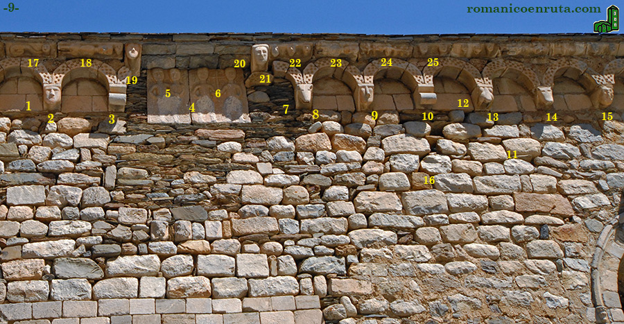 Las ménsulas en que apoyan los arquillos ciegos (enlaces 1 a 3 y 7 a 16) llevan los motivos ya vistos en las de la página anterior, a saber: cabezas humanas, alguna de ellas muy deteriorada (enlaces 1/2/9/15 y foto inferior), cabezas de animal (enlaces 7/8/14), rollos horizontales (enlaces 3/10) y figuras simiescas o monstruosas (enlaces 12/13).