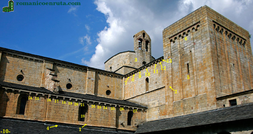 En la foto 10 os detallamos algunos de los canecillos que se observan desde el patio del claustro, concretamente los del brazo derecho del transepto y los que sostienen la cubierta de la nave lateral; así como el cimborrio con su pequeña espadaña (enlaces 2/3) y la torre de Sant Just (enlaces 5/6). De izquierda a derecha, los canecillos del brazo del transepto son: motivos vegetales (quizá flores) en un recipiente (enlace 7); bola en caveto (enlace 8); flor de ocho pétalos con una cuatripétala en el centro (enlace 9); rostro humano tirando de las comisuras de sus labios con el dedo medio (enlace 10); cabeza de león (enlace 11); cara barbada con cuernos, tal vez el diablo (enlace 12); y por último dos hojas simétricas (enlace 13).