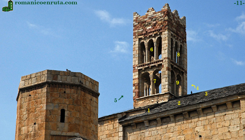 En el piso superior se abren tres arcos en cada una de las caras y en el piso inferior se abren dos. Las columnas que sostienen los arcos son dobles y sus capiteles están esculpidos. Ambos pisos se decoran con un friso de dientes de sierra que se apoya sobre canecillos con representaciones diversas, como caras, cabezas de animales o motivos geométricos (enlaces 6 a 9).
