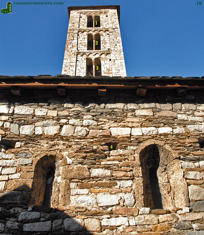 En la foto 15 os mostramos la cara este de la torre. El primer piso se decora con arcuaciones ciegas (enlace 6) y los cinco restantes llevan un friso de dientes de sierra sobre los arquillos; todos ellos presentan ventanas geminadas con una columna central cuyo capitel es de finos rollos. En el piso superior se encuentran las campanas.