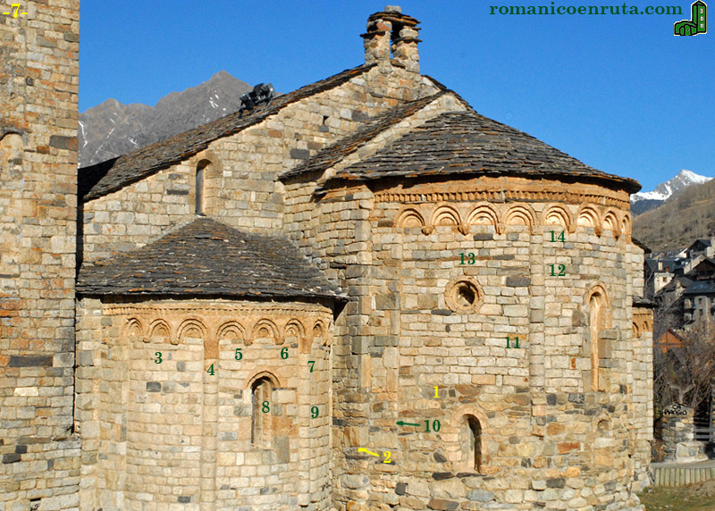De hecho, las nuevas ventanas axiales de cada uno de los ábsides constan de aberturas en forma de aspillera (enlaces 8/9) bajo una serie de arcos de medio punto en degradación. Los elementos decorativos de cornisas y ventanas, por otra parte, se ejecutan con una piedra distinta a la de los muros, algo más rojiza y ligera. En los tres ábsides se repite la misma decoración de estilo lombardo (enlaces 3 a 7 y 12 a 14): friso de dientes de sierra por encima de series de arcuaciones ciegas separadas por lesenas cilíndricas.
