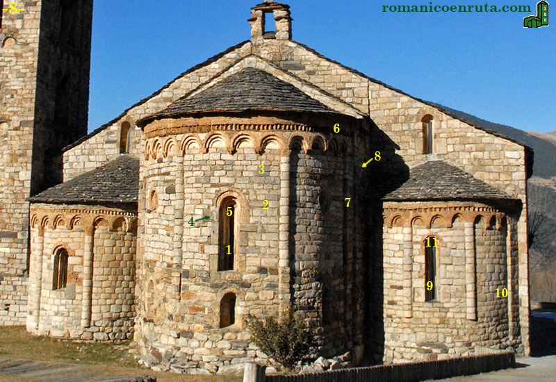 En la foto inferior ampliamos algunos de los elementos estructurales de la cabecera, los del lado norte. En el enlace 8 os ofrecemos una vista de conjunto de los tres ábsides que podréis obtener si os alejáis un poco del templo, subiendo por la carretera que lleva al Pla de l'Ermita, pasando por delante del restaurante que os hemos recomendado en la ruta y bajando por una calle algo empinada que os devuelve a la vía que une Sant Climent con Santa Maria. Un paseo de unos 10 minutos que vale la pena.