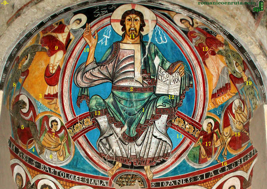 Pasemos a la reproducción de las pinturas del ábside central. En el registro superior, el que ocupa la bóveda de horno, se representa una Maiestas Domini rodeada por el Tetramorfos (foto inferior). Cristo, sentado sobre la bóveda celeste (enlaces 1/2), apoya los pies sobre la tierra; bendice con su mano derecha alzada (enlace 10) y, en la izquierda, sostiene un libro en que podemos leer la inscripción "EGO SUM LUX MUNDI" ("Yo soy la luz del mundo") (enlace 12). Las letras alfa y omega flanquean un rostro de Cristo que transmite solemnidad y serenidad (enlace 11). Fijaos en la perfecta simetría de sus elementos: el cabello, la barba, la nariz, los ojos y las mejillas.