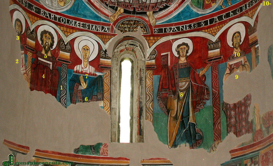 María bendice con su mano derecha y en la izquierda, cubierta por el manto, sostiene un cuenco que despide rayos de color rojizo que, según la tradición iconográfica, representan a María como símbolo de la Iglesia, quien recoge, al pie de la cruz, la sangre de Cristo. Los apóstoles Bartolomé (enlaces 4/5) y Jaime (enlaces 9/10) sostienen contra el pecho sendos libros, mientras que Juan lo eleva en su mano derecha (enlace 8). A la derecha de Bartolomé, todavía identificable por la inscripción, encontramos a Tomás. En el lado contrario, junto a Jaime, aparecen los escasos restos de otro apóstol, quizá Felipe.