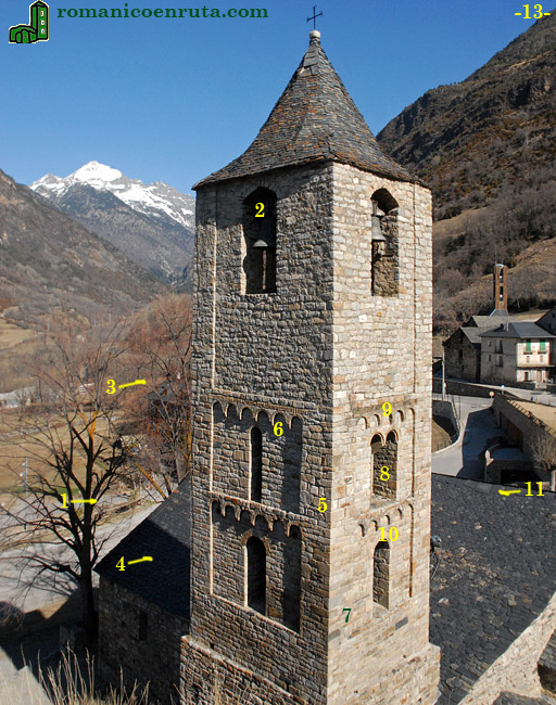 La separación entre los dos primeros pisos se realiza por medio de series de arcos ciegos (cinco en los lados este y oeste y seis en las caras sur y norte, enlace 10) mientras que la transición entre el último piso de ventanas y el cuerpo superior añade a las series de arquillos ciegos un friso de dientes de sierra (enlaces 6/9). Las ventanas del piso inferior difieren en amplitud y las del piso superior son geminadas en todas las caras salvo la de la cara sur, de vano simple y muy estrecha.