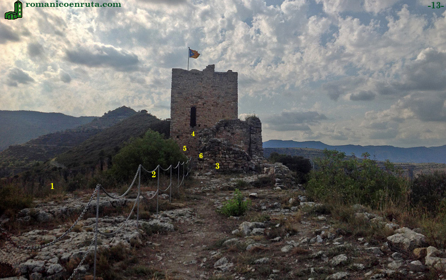 Una escalera metálica facilita el acceso a la estrecha plataforma sobre la que se construyó el castillo (foto inferior). De las antiguas dependencias solo nos quedan la torre de poniente (enlaces 2/4), el muro septentrional, de aproximadamente unos 24 metros de longitud (enlace 5), y una dependencia adosada a este (enlace 3) que presenta una gran abertura en su lado meridional (enlace 6).