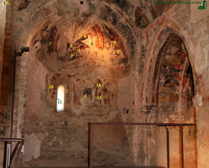 En la absidiola sur (recordemos que en este caso los originales se encuentran expuestos en el MNAC) la decoración muraria se divide en dos registros: en la bóveda de cascarón se representa una Ascensión, tema no muy frecuente en el románico catalán, y en el semicilindro absidal la Virgen (enlaces 12/13) y los apóstoles (enlaces 10 a 12) contemplan la escena. Cristo, rodeado por la mandorla, lleva en su mano izquierda un objeto semejante a un disco (de posible significado eucarístico, enlace 6) y lo flanquean dos ángeles, el del lado izquierdo apenas reconocible (enlaces 7 a 9).