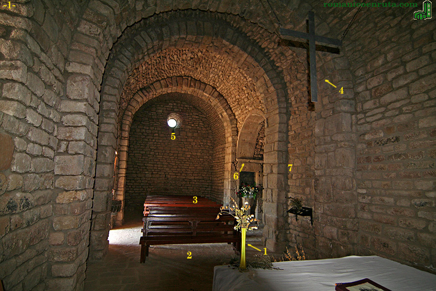 Y es una satisfacción comprobar que cuando se acometen obras de mejora se realizan con criterio. En la foto superior (con enlaces a distintas fotografías en cada uno de los números) vemos la nave desde el semicírculo absidal. La cubierta consiste en una bóveda de cañón reforzada por tres arcos fajones (enlaces 1 y 7). Aparte de las ventanas del ábside, un óculo en el hastial de poniente es la única abertura que permite la iluminación del interior (enlace 5).