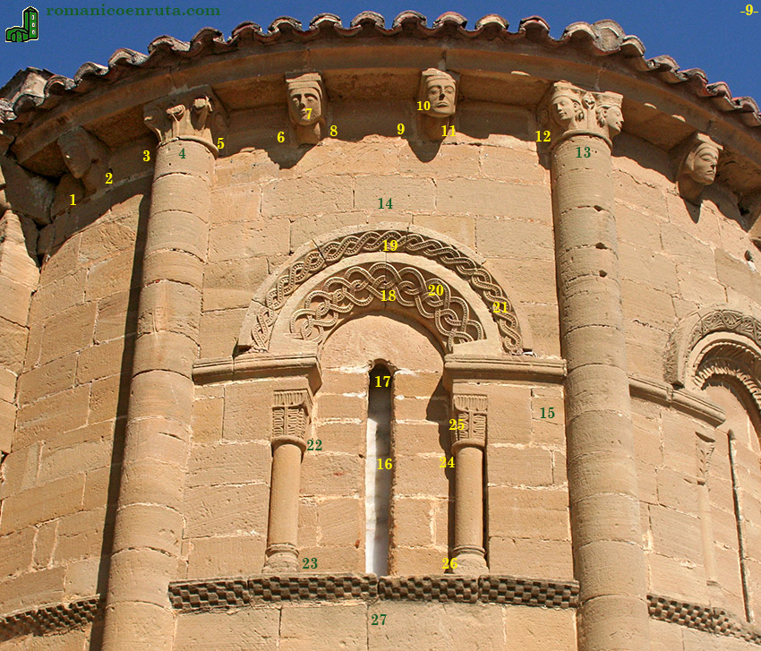 La primera calle del semicírculo, flanqueada por el muro del presbiterio y la primera semicolumna, es más estrecha que las centrales y bajo la cornisa presenta un único can en el que se esculpe una cabeza humana (enlaces 1 y 2). El capitel de la primera semicolumna (enlaces 3 a 5) se decora con motivos vegetales a base de hojas verticales que se enroscan formando volutas en los extremos. Los canecillos de la calle 2 llevan sendos rostros humanos (enlaces 6 a 11) y a su derecha, el capitel de la segunda semicolumna es el más interesante del conjunto, con dos cabezas humana coronadas separadas por un tallo vegetal (enlaces 12 y 13).