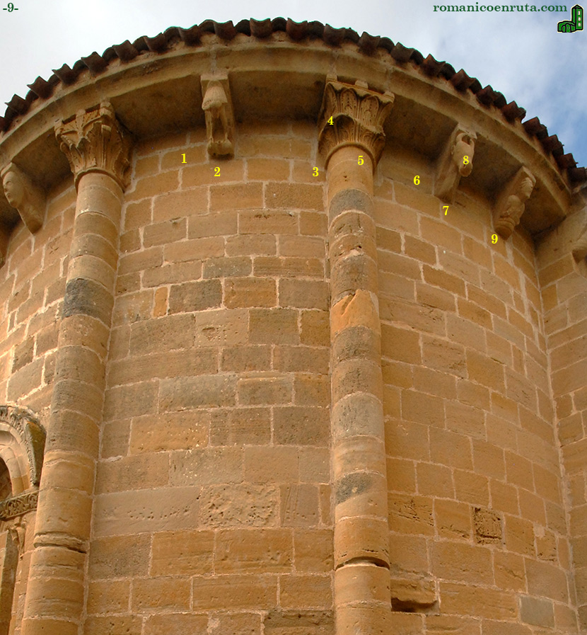 Las calles 4 y 5, las del lado noreste (foto 9) son lisas como las dos primeras del lado sureste. La única decoración reseñable se encuentra bajo el alero de la cubierta donde encontraremos tres canecillos más, uno en la calle cuatro y dos en la cinco, y un nuevo capitel, en este caso el de la cuarta columna entrega. Lo normal es que las ventanas se abran en cada una de las calles del semicírculo, pero en Ochánduri las dos que deberían ocupar las calles laterales (ver, por ejemplo, el ábside de Castilseco o Villaseca) se trasladan a los tramos rectos del presbiterio, que describiremos en la página siguiente aunque solo la del lado norte puesto que la del lado meridional fue cegada al añadirse la sacristía en el siglo XVI.